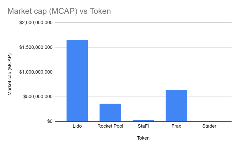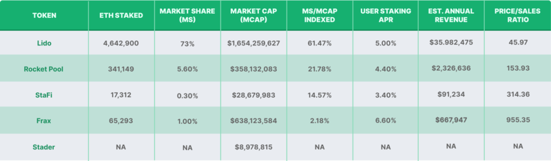 The current market share is led by Lido, which also has the best valuation when we compare the market share to market cap, where the higher value is preferable, and the price to sales ratio where the lower value is preferable.