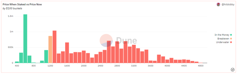 Taking a look at the price when ETH was staked vs. now, it shows that most people who staked ETH are at a loss currently, which may encourage them to continue holding, potentially continuing a bullish narrative for ETH.