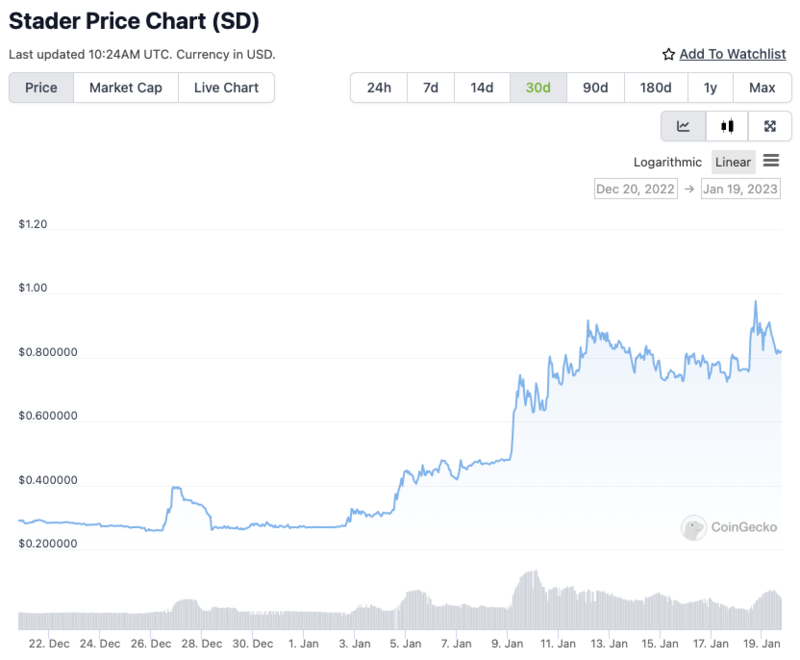 Stader's price has more than doubled over the past month, possibly due to their low market cap prevoiusly.