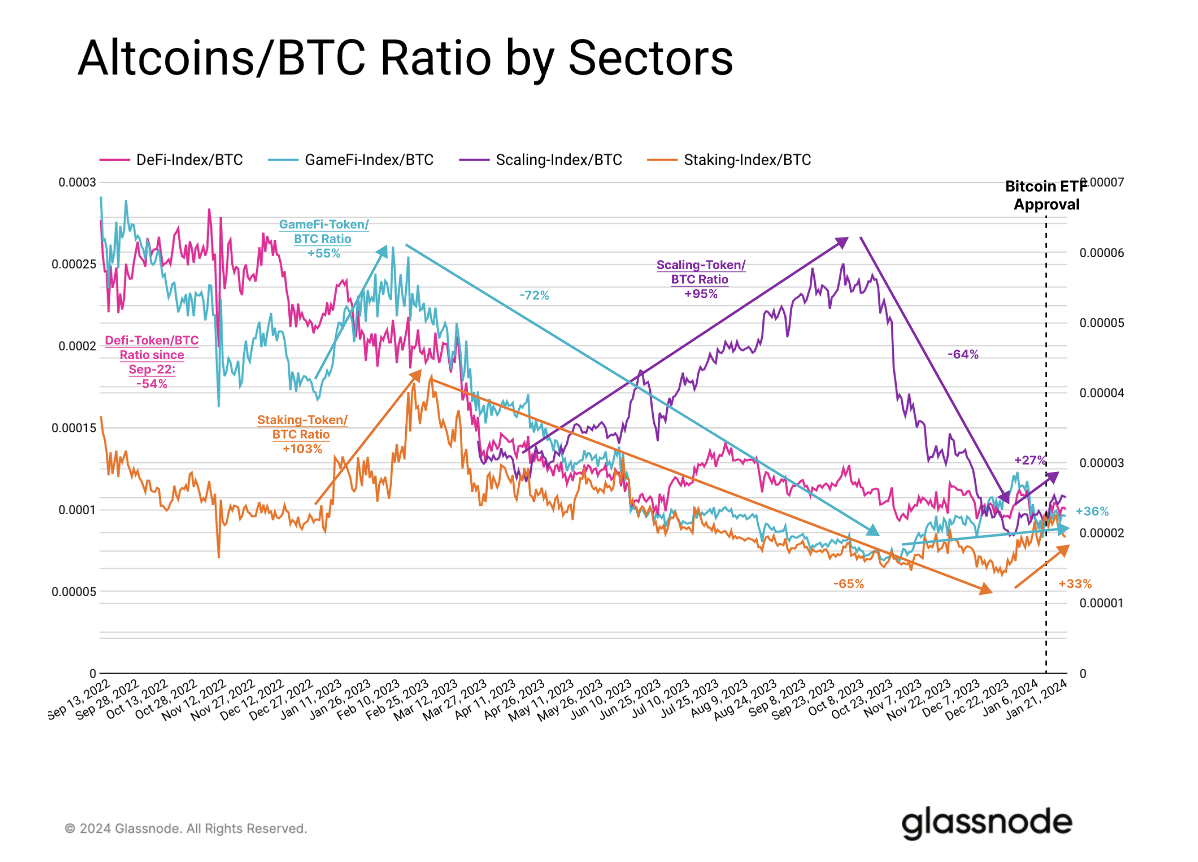 - We also assess the relative performance of Solana, scaling tokens, and various sector indexes relative to BTC and ETH as a gauge for risk appetite in a post-ETF world.