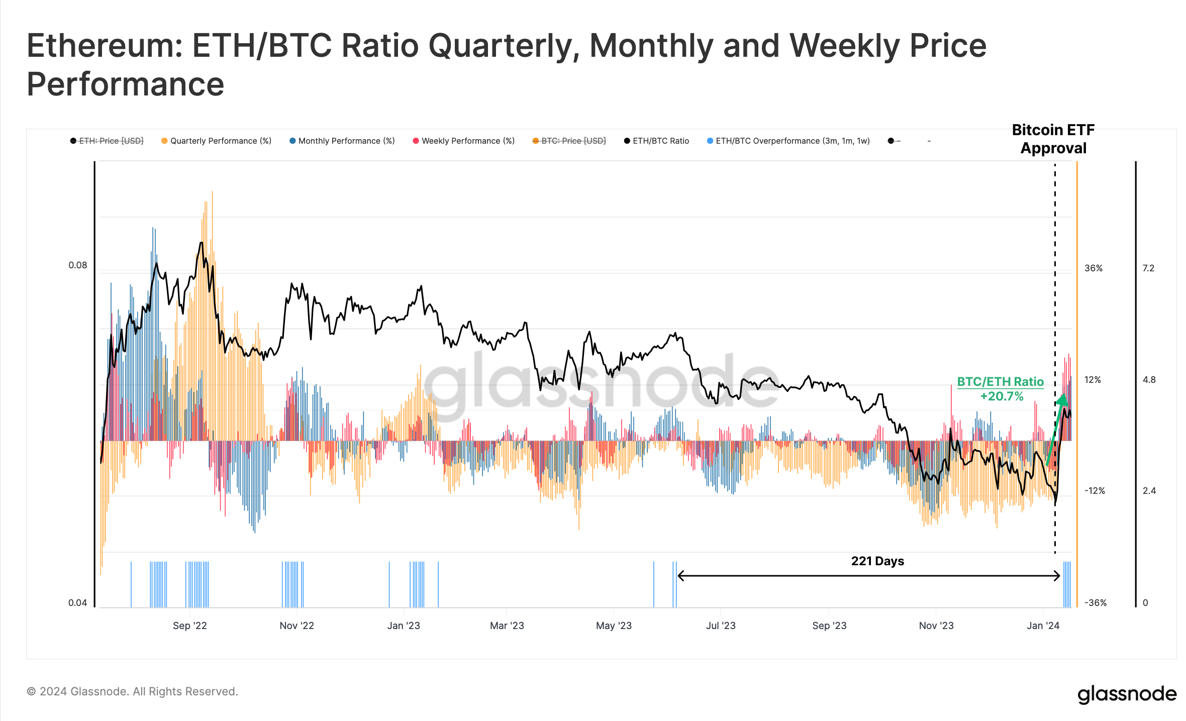 - In response to the approval of a suite of Bitcoin ETFs, Ether and Altcoins have rallied strongly last week. ETH managed to outperform BTC for the first time since October 2022.