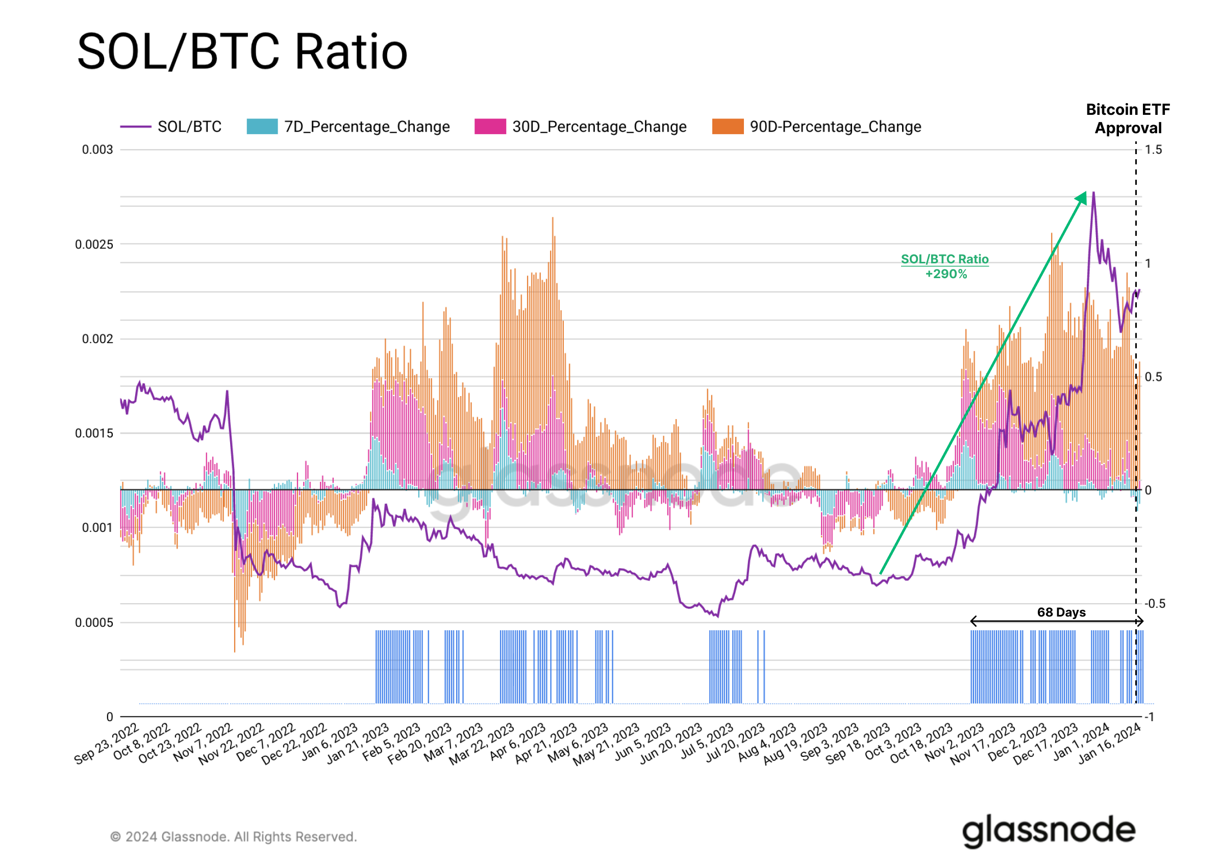 The SOL/BTC ratio has increased by 290% since October 2023, and significantly outperformed ETH during this period. Interestingly, unlike ETH, SOL's price did not experience any significant upwards revaluation after the BTC ETF approvals.