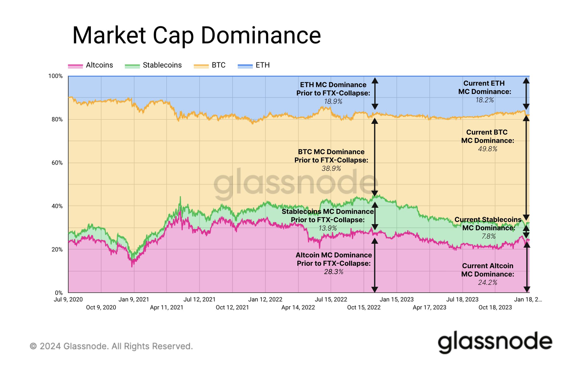 On the other hand, ETH has maintained its market cap dominance, ranging from 18.9% to 18.2%. It is mainly Altcoins that have lost market share in the crypto markets with their market cap dominance dropping from 28.3% to 24.2%, while Stablecoins have also decreased their share from 13.9% to 7.8%.