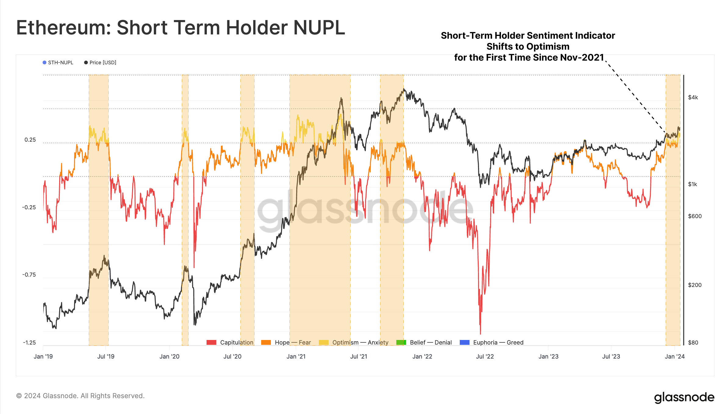 Positive market sentiment for ETH is supported by another indicator: Net Unrealized Profit/Loss (NUPL) for short-term token holders. STH-NUPL has crossed above 0.25 for the first time since the Nov-2021 ATH.