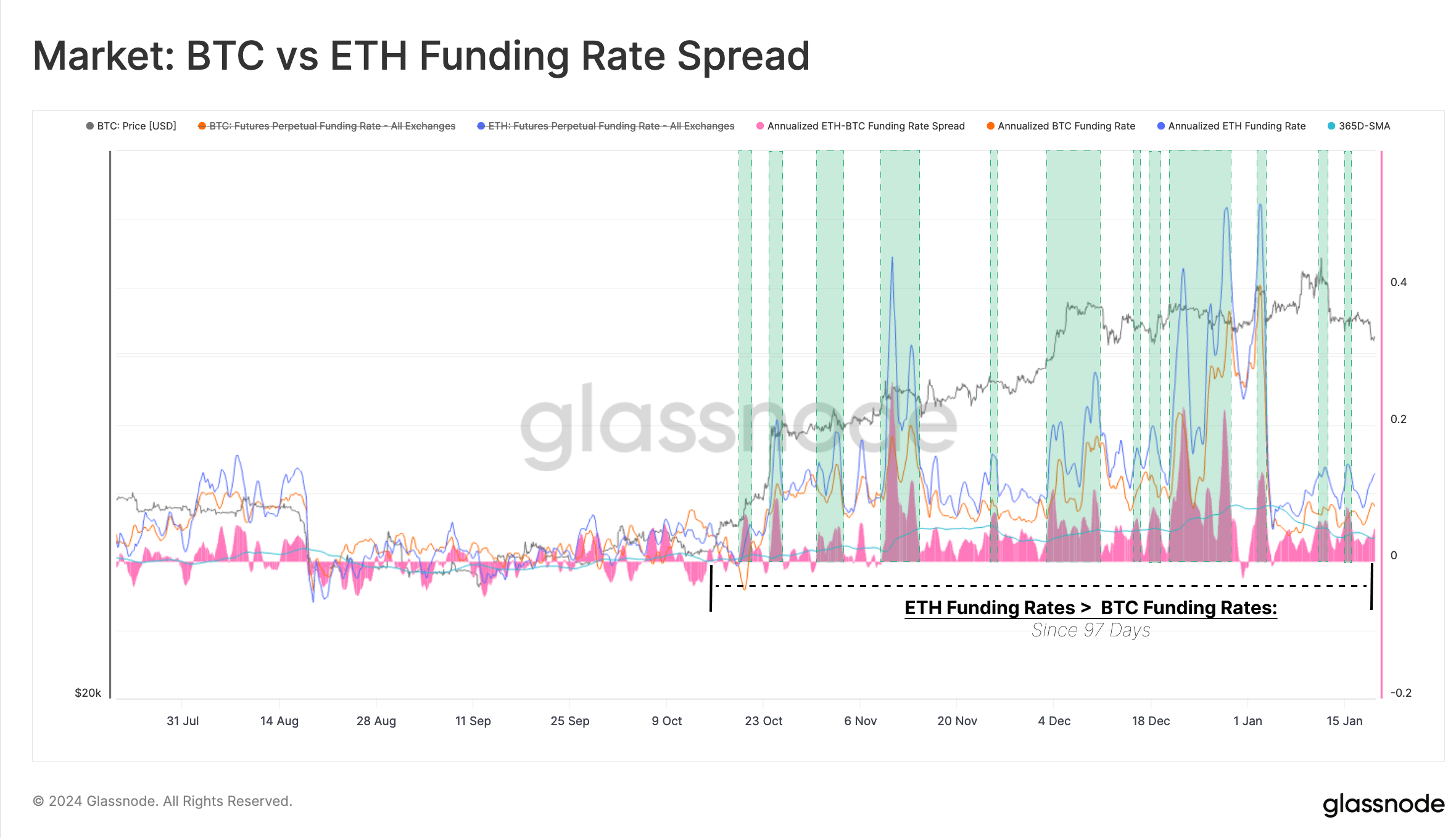 Interestingly, when the ETH-BTC funding rate spread spikes above its 1y average, it typically aligns with local peaks for ETH prices.