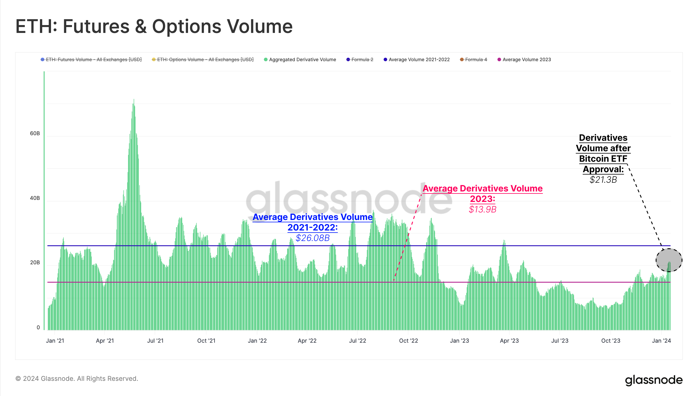 Given Ethereum's recent rally, it's worth examining its derivative markets to assess how leveraged markets are responding. In recent weeks we can see a meaningful uptick in trade volume for both futures and options contracts. Combined, ETH markets experienced a total trade volume of $21.3B/day, surpassing the average volume of 2023 ($13.9B), but it is still far from the typical levels seen in 2021 to 2022.