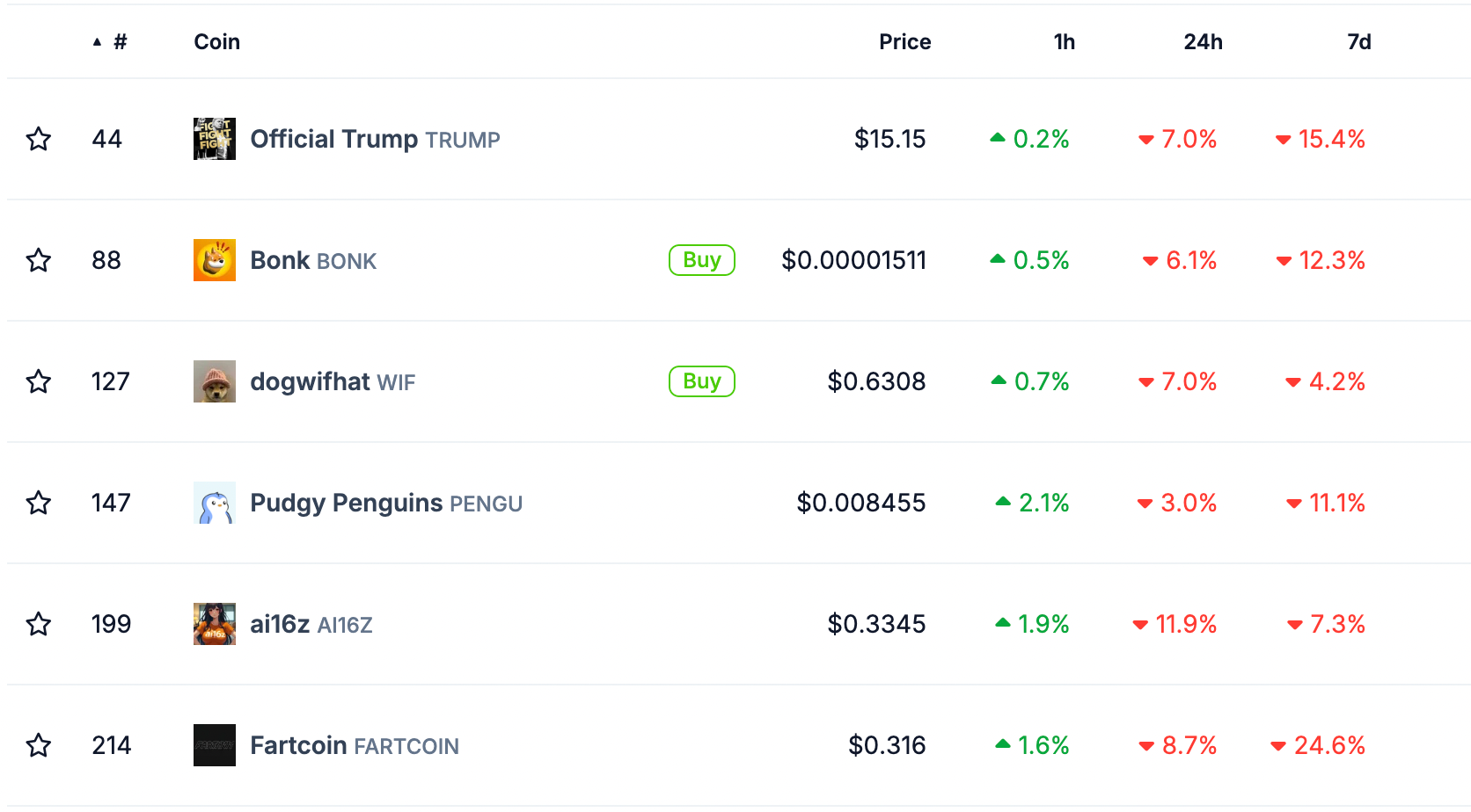 Top Solana memecoins, such as Official Trump (TRUMP), Bonk (BONK), and Dogwifhat (WIF), have suffered huge losses on 24-hour and 7-day adjusted timeframes, as shown below.