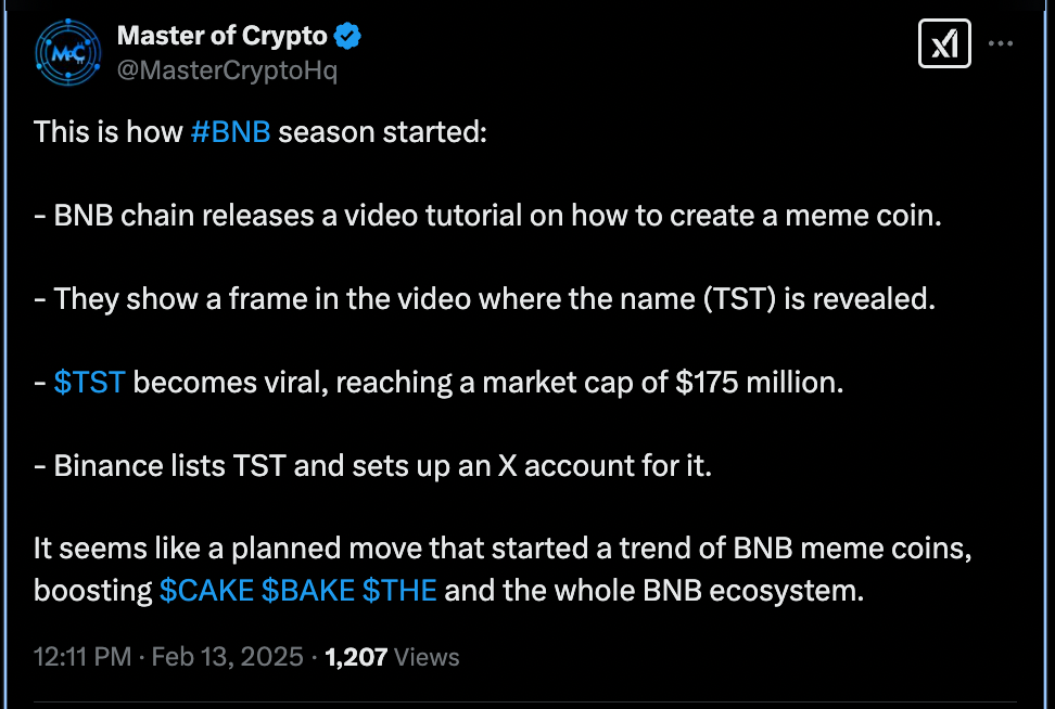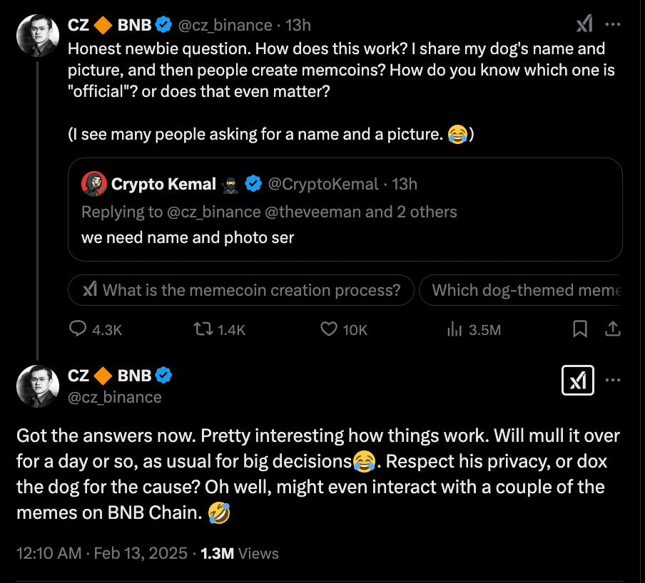 - On Feb. 12, 2025, CZ engaged in a conversation on X (Twitter) that accidentally triggered memecoin speculation.