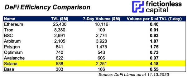 And that’s not to mention the reality that active addresses can be manipulated. An alternative metric, namely capital efficiency (i.e., decentralized exchange volume per dollar of total value locked), suggests Solana has outpaced Ethereum in recent months.