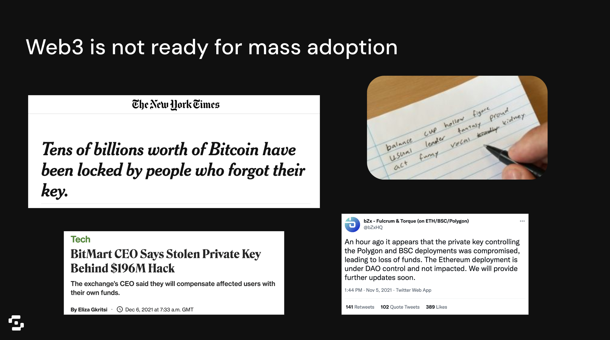 The limitation of EOAs not only undermines the user experience but also poses serious security risks. Compromised or misplaced private keys associated with EOAs can lead to irreversible losses. And there is a general lack of security features such as allow- or deny-list functionalities or transaction thresholds. Research showed that over $3.8B was lost due to crypto hacks in 2022 alone.