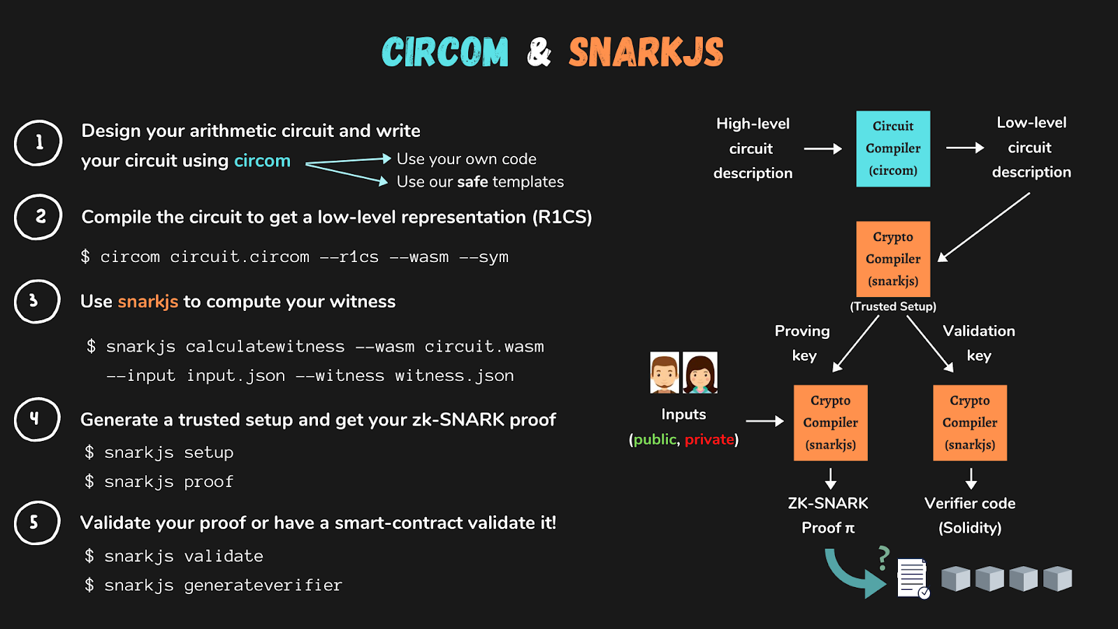 Circom, a specialized DSL meticulously designed for ZK circuit development, is the brainchild of Jordi Baylina and the iden3 team. The Circom compiler, coded in Rust, serves the purpose of compiling circuits authored in the Circom language. Notably, Circom has been the preferred choice for prominent ZK applications in real-world use cases, such as Dark Forest and Tornado Cash. Its popularity is attributed to its impressive performance metrics, featuring rapid browser proving times courtesy of optimized WASM proofs, fast server-side proving via rapidsnark, and highly efficient on-chain verification.